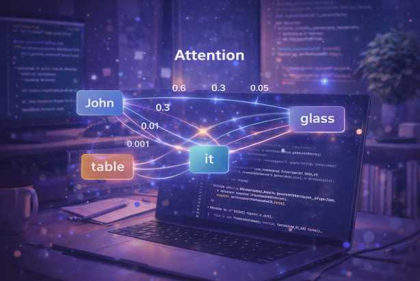 Below is a tiny C# demo of attention. It uses a toy embedding setup where the token "it" ends up most similar to "glass", so the attention weights should rank "glass" highly.